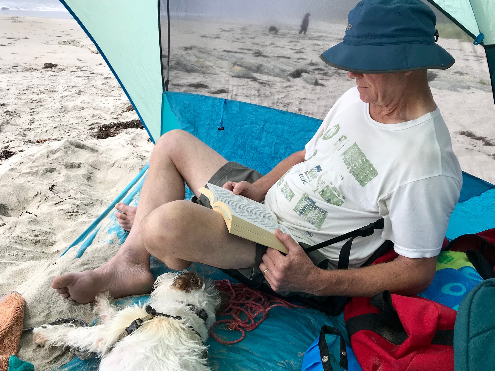 After our walk, we popped up the road for a bite of lunch at the Ploughman's Lunch, before returning to the beach for a couple of hours of reading (Husband and me) and snoozing (Jackie Blue). The fog never lifted entirely but that was okay because it helped moderate the air temperature.